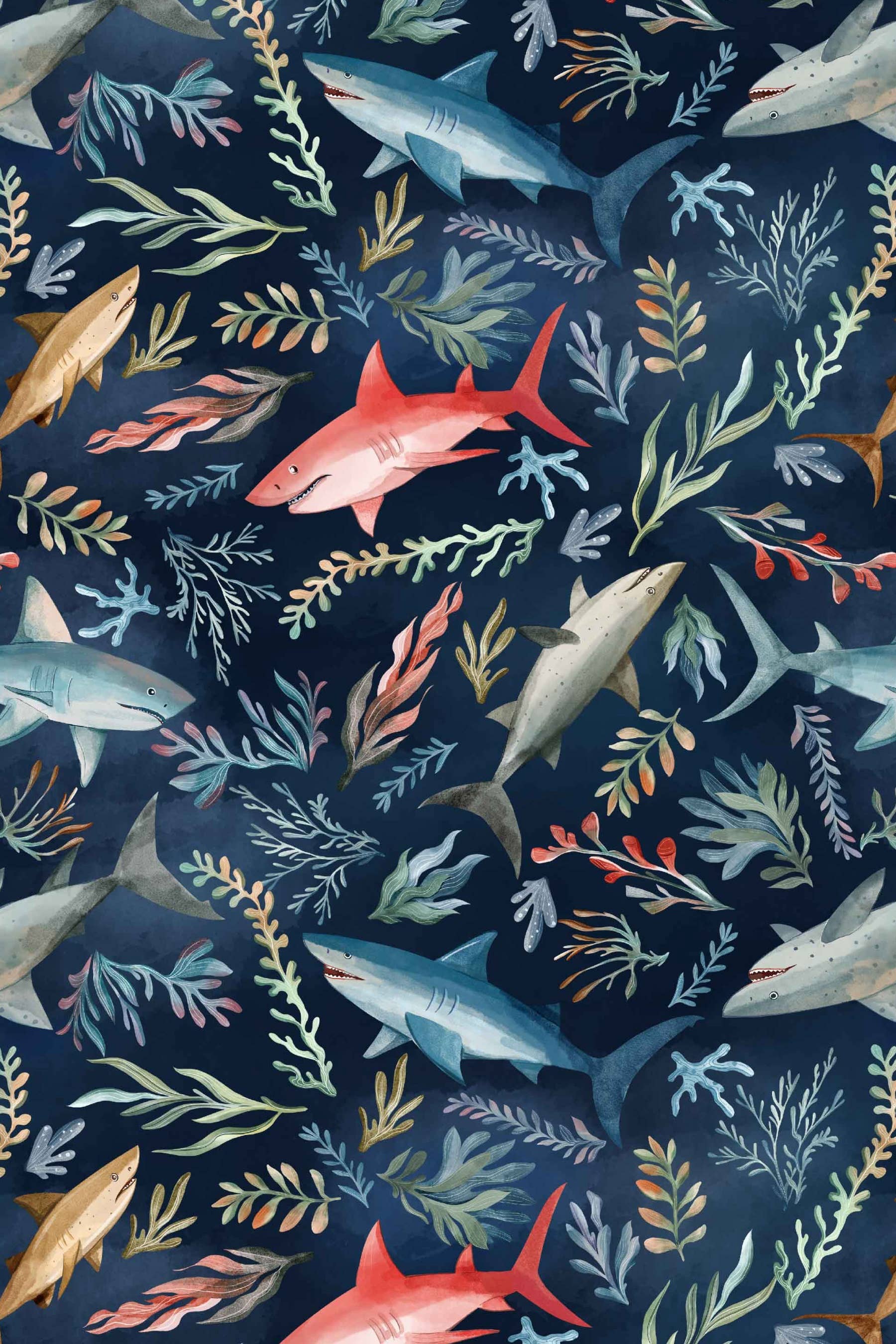 Sharks print in navy / multi color • Side seam POCKETS • Original print artwork by Sweven Print Design • Smooth "Soysilk" fabric with great stretch! • Knee length (hits approximately at the knee) • Size M has a High-Point-Shoulder To Hem length of ~42-44 in. • The bodice is lined • Invisible YKK zipper on left side when worn • Sweetheart neckline • Adjustable shoulder straps with sliders in back • Sleeveless • Raised waistline • Gathered skirt • Removable self-fabric sash • Two belt loops, at sides • Smocking in center-back • The model is 5 ft. 6 in., 35-25-37, and is wearing size S