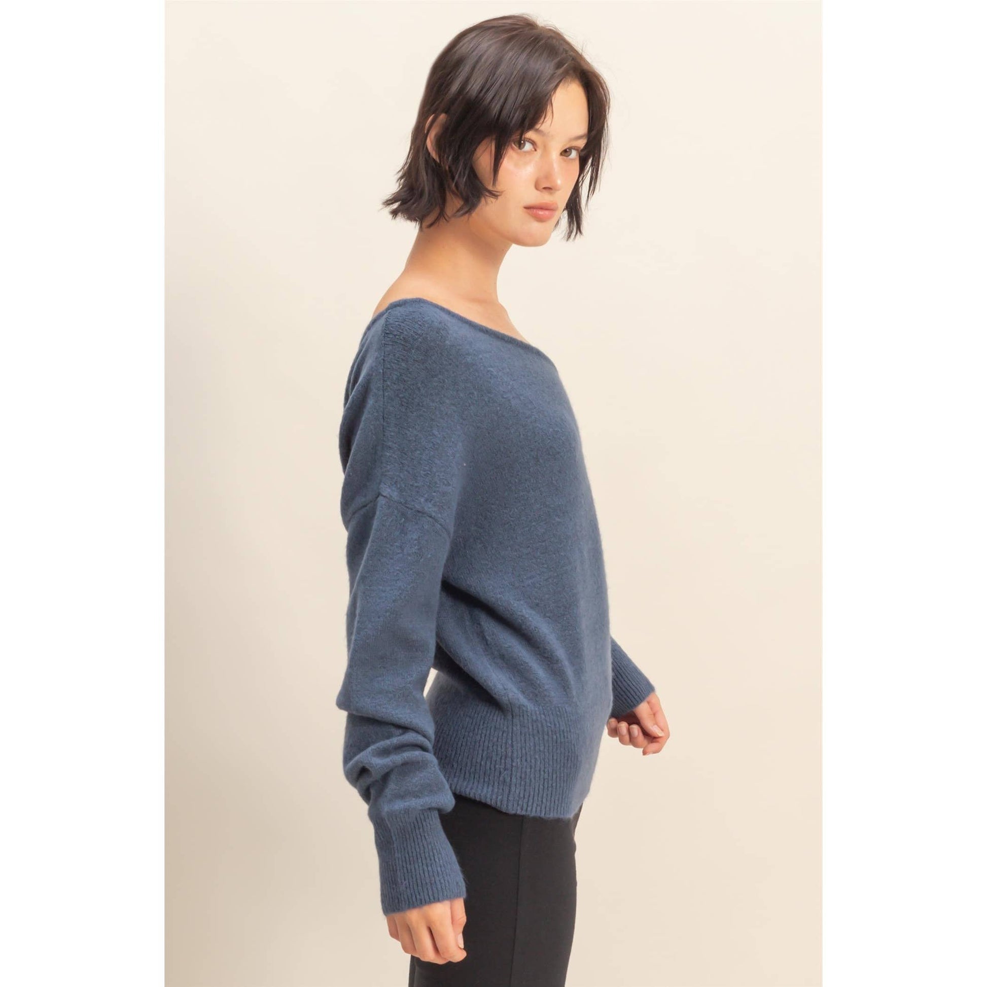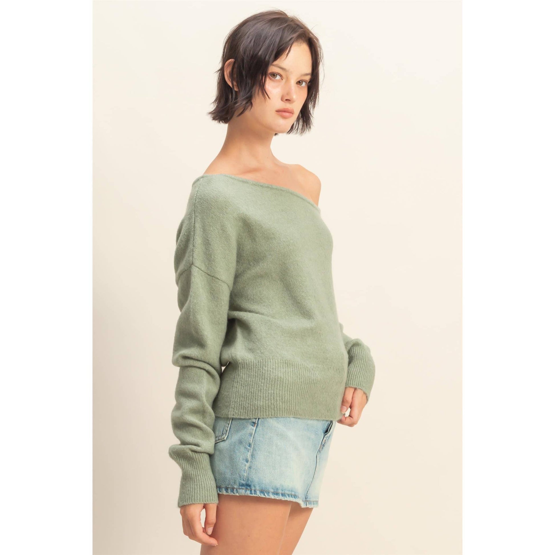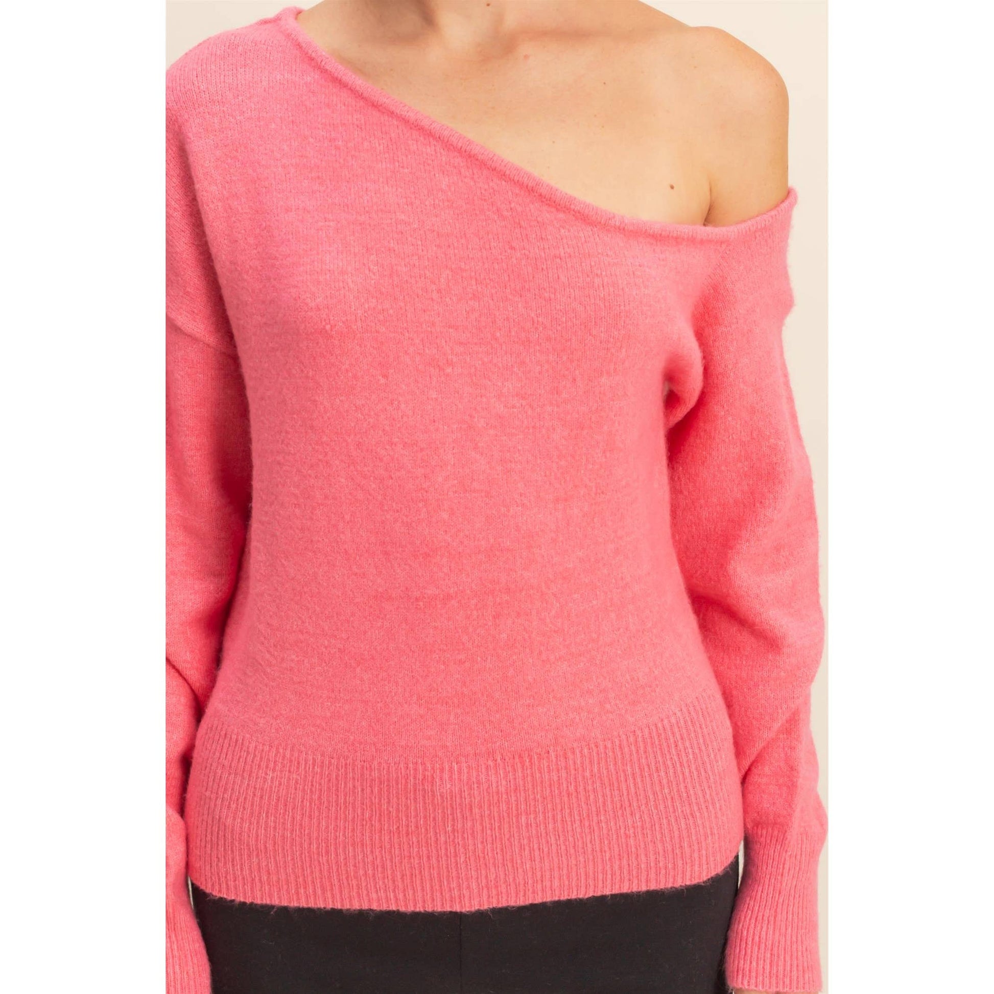 This off-shoulder knit sweater features a relaxed fit with a unique one-sided neckline that exposes only one shoulder. The opposite side offers a dropped shoulder for added comfort and style. Finished with a fitted ribbed hem, it pairs effortlessly with jeans or skirts. Ideal for chic fall layering and casual outings.