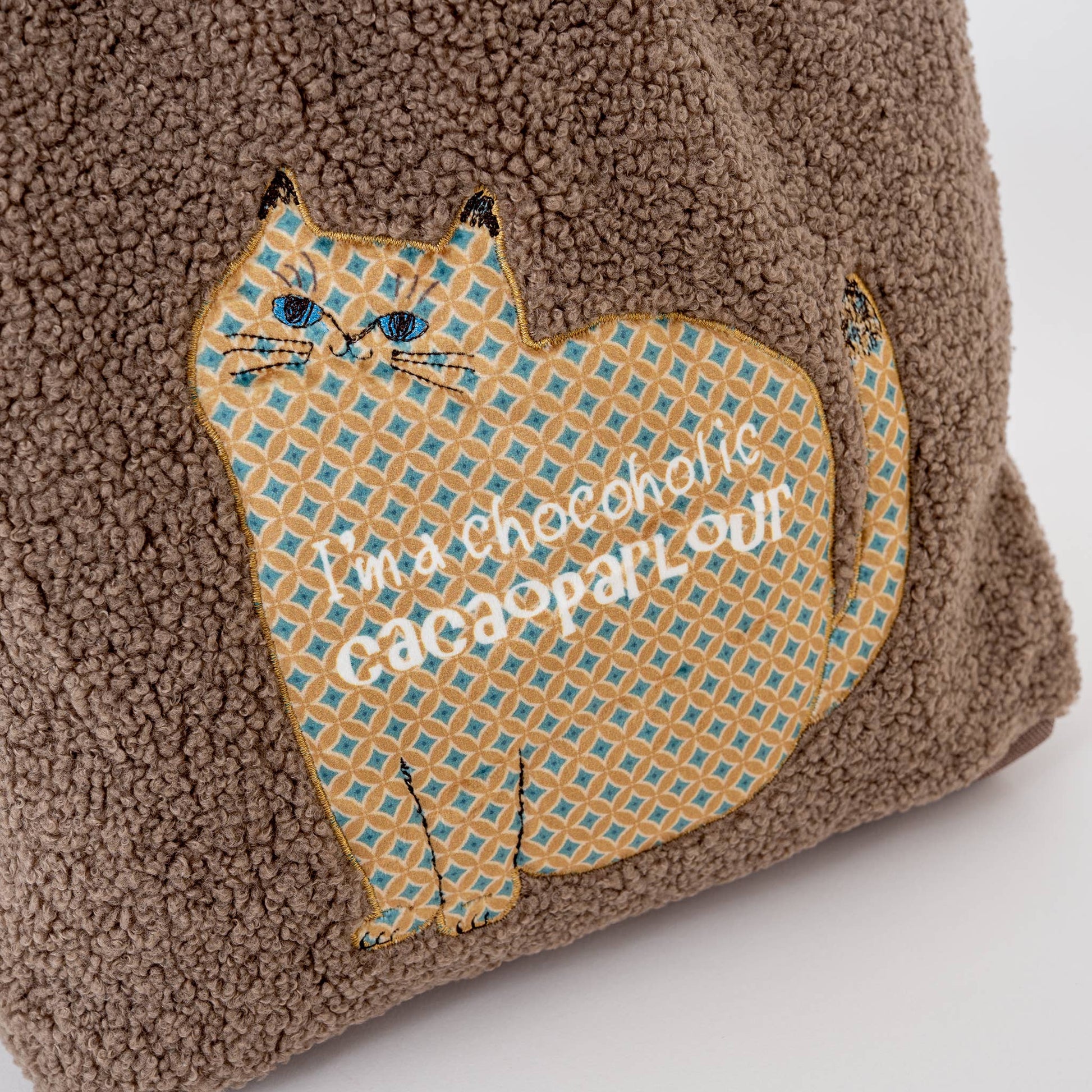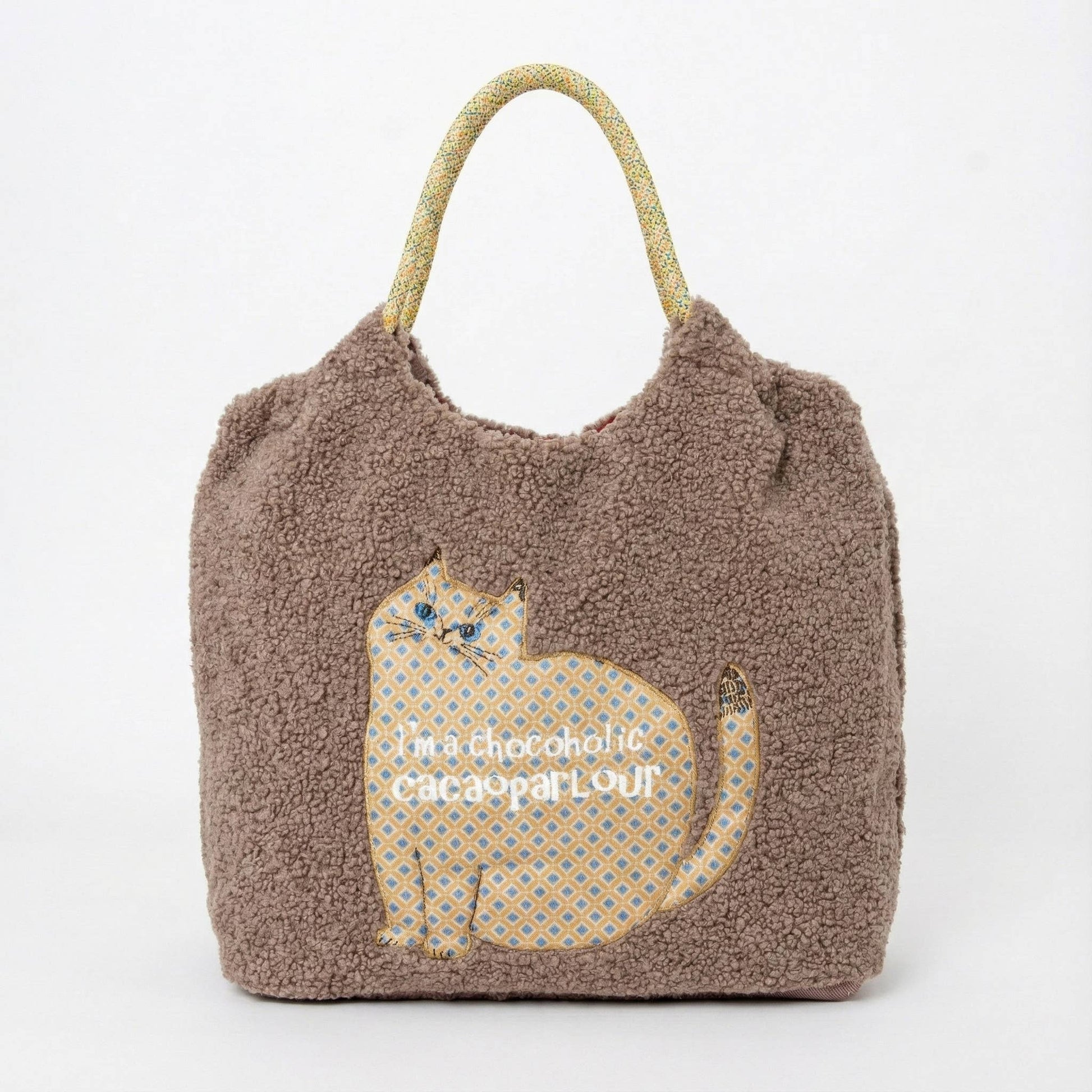 This tote is designed to be cuddled! The exterior is made from a plush, soft-touch Teddy Fleece (or Sherpa) in a warm brown tone, offering an irresistible tactile appeal that customers will gravitate toward. The bag features a playful appliquéd and embroidered cat silhouette with the fun slogan "I'm a chocoholic" (or similar playful phrase).