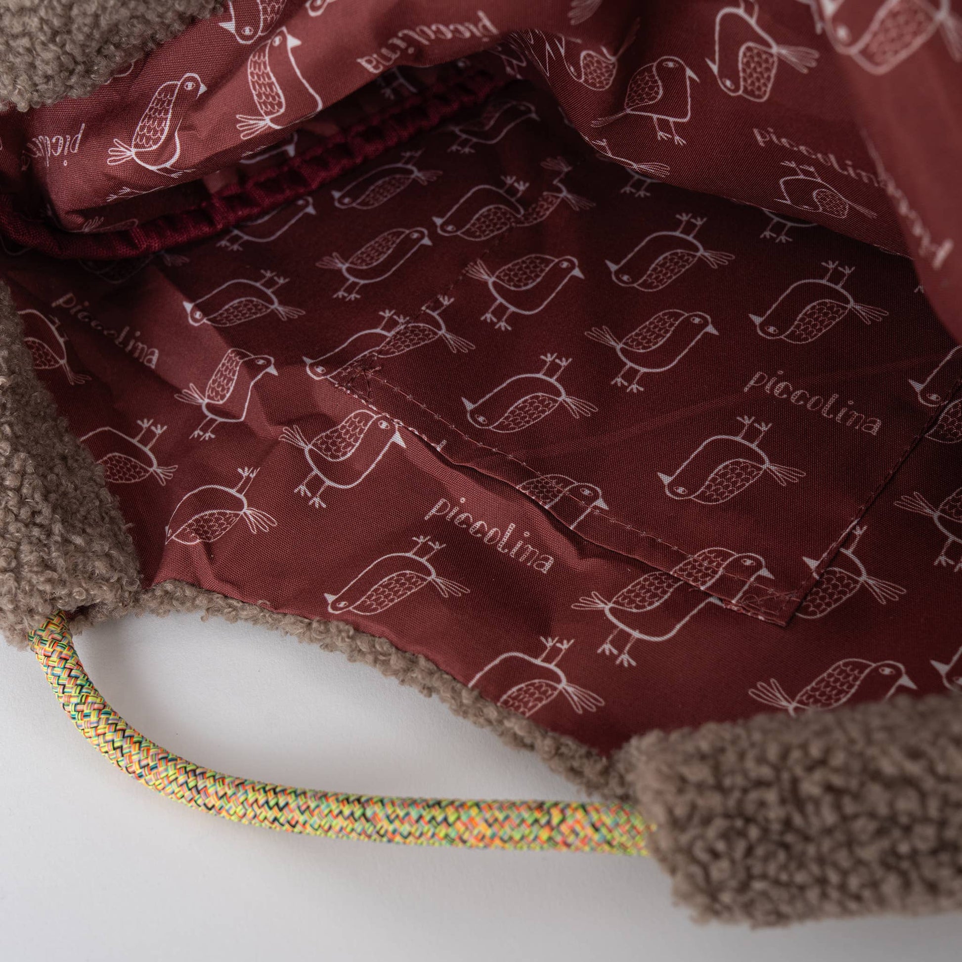 Inside, the attention to detail continues with a silky, custom-printed lining (featuring the bird/text pattern shown) and an inner pocket for organization. The sturdy, multi-colored rope handles add a vibrant pop of contrast, making this bag both cozy and chic. It's the perfect everyday bag for carrying essentials, books, or light shopping.