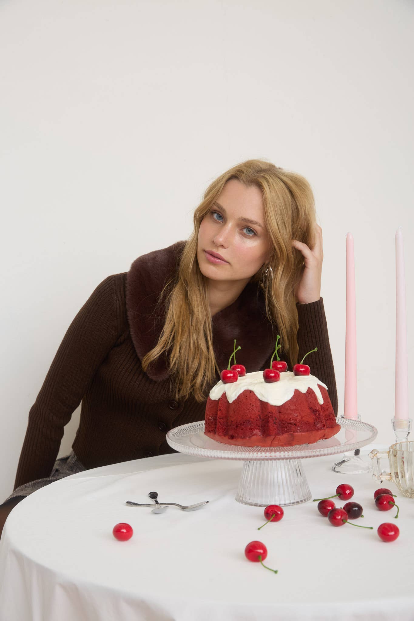 FAUX FUR COLLAR BUTTON DOWN SWEATER KNIT CARDIGAN: BLACK