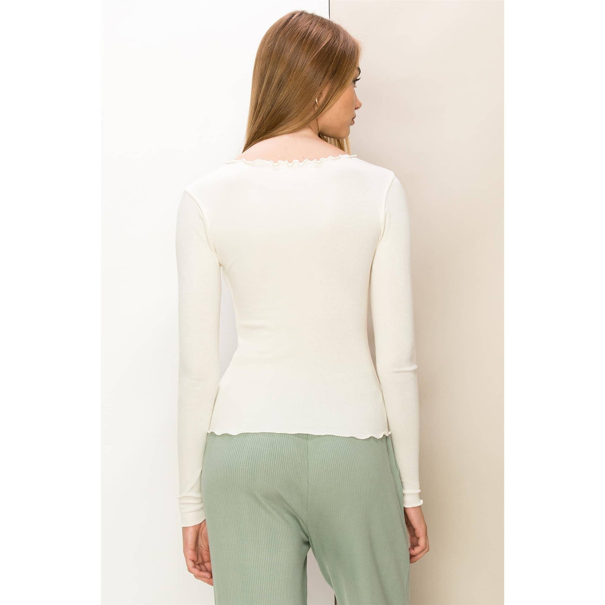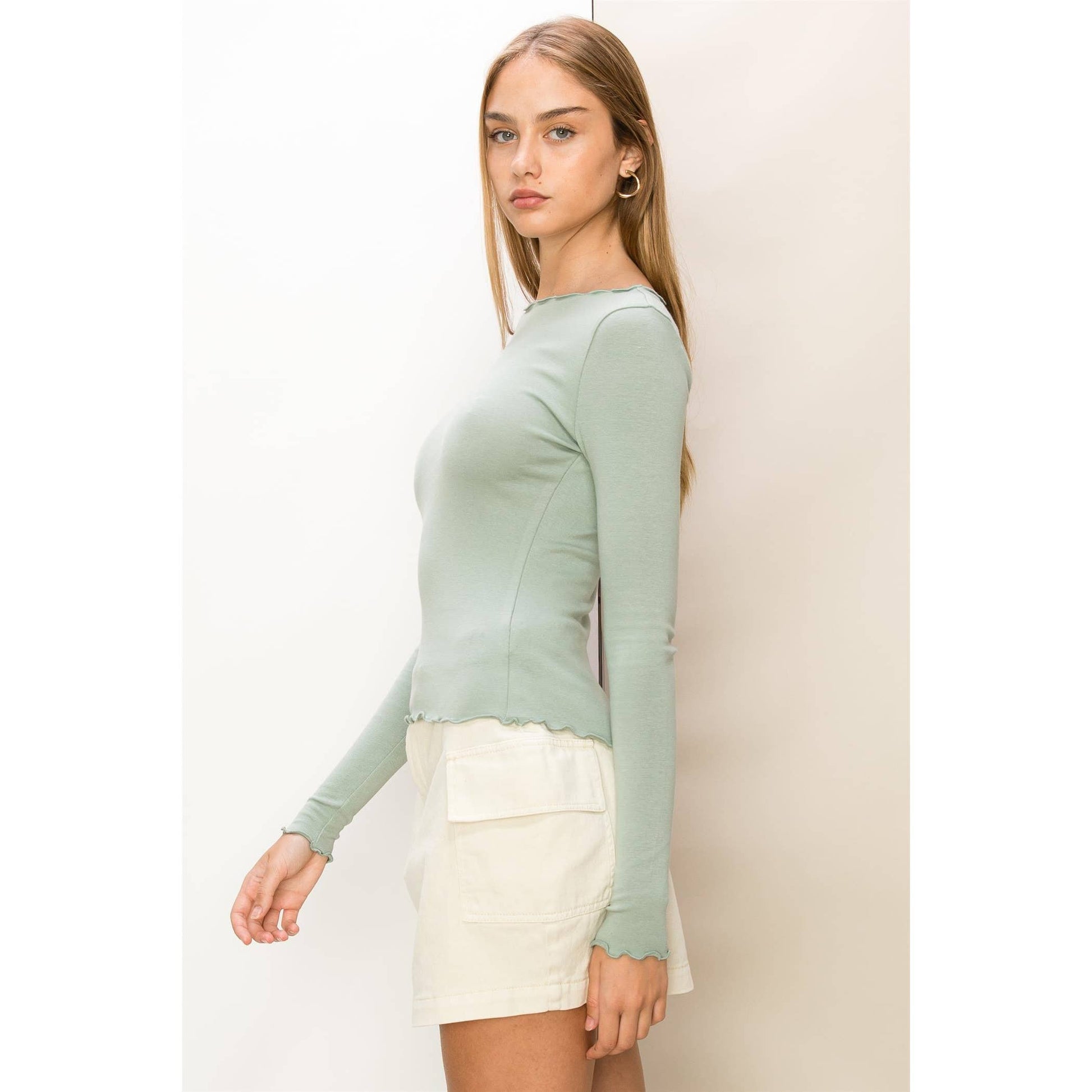 This top features a classic round neck, long sleeves and a fitted bodice that is all about flattering your natural feminine structure. Lettuce edges make for a stylish finishing touch.