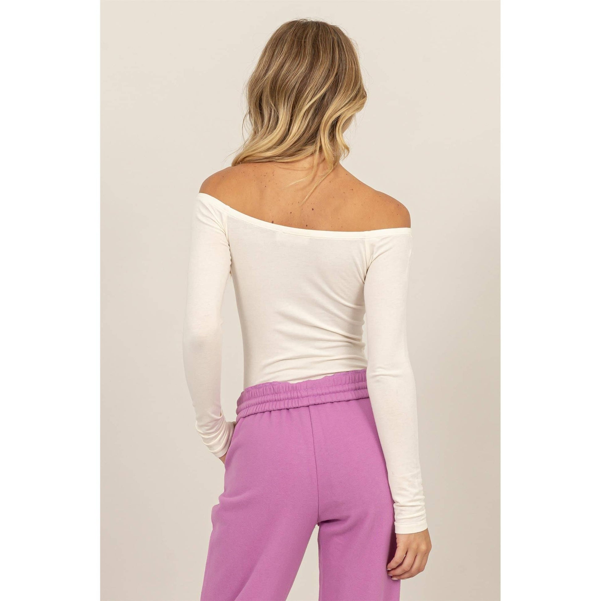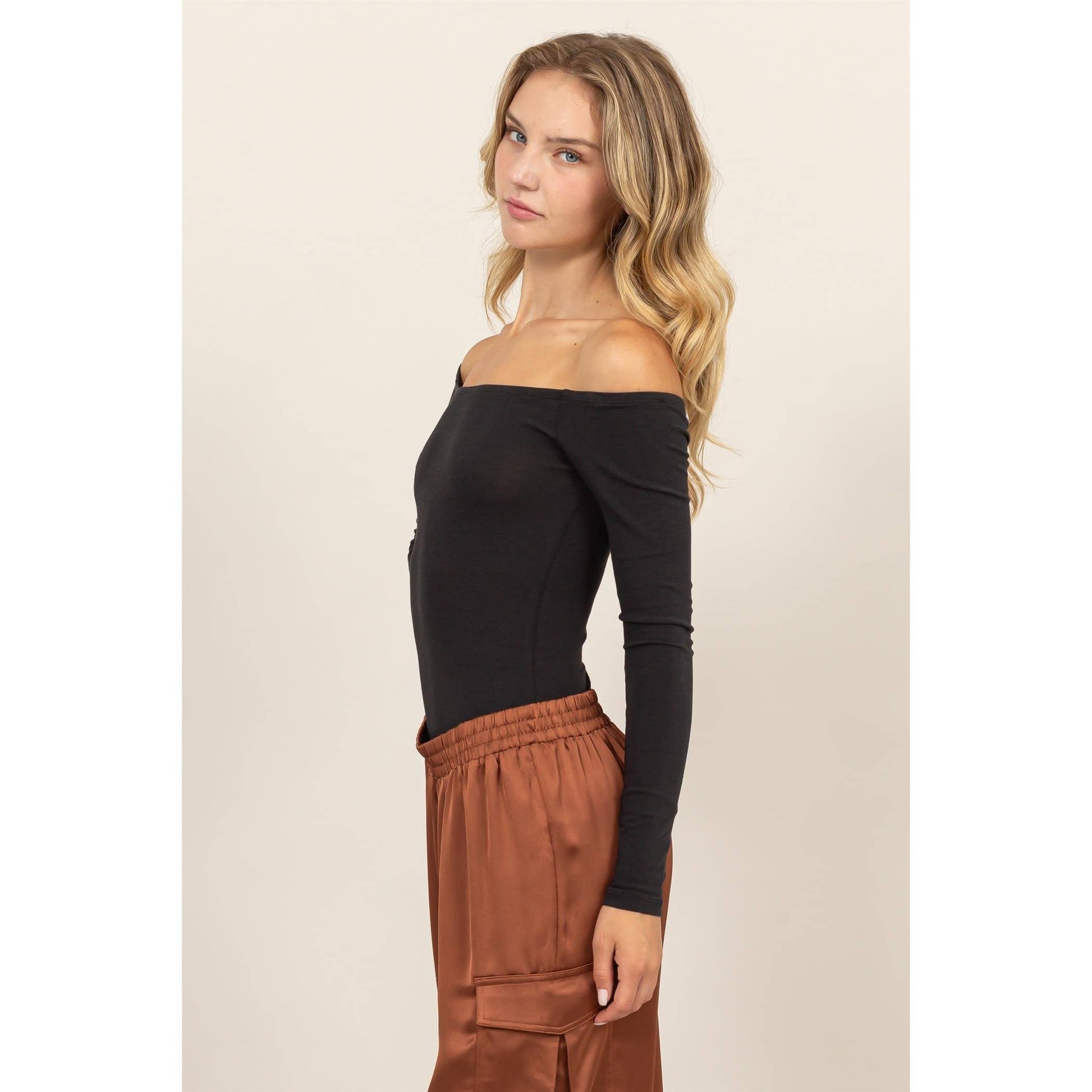 Embrace Elegance With This Off-The-Shoulder Long Sleeve Bodysuit. Crafted To Highlight Your Shoulders, This Bodysuit Features A Sleek And Slim Fit That Flatters Your Figure. The Soft, Stretchy Fabric Ensures All-Day Comfort And A Seamless Look Under Any Outfit. Perfect For Dressing Up With A Skirt Or Keeping It Casual With Jeans.