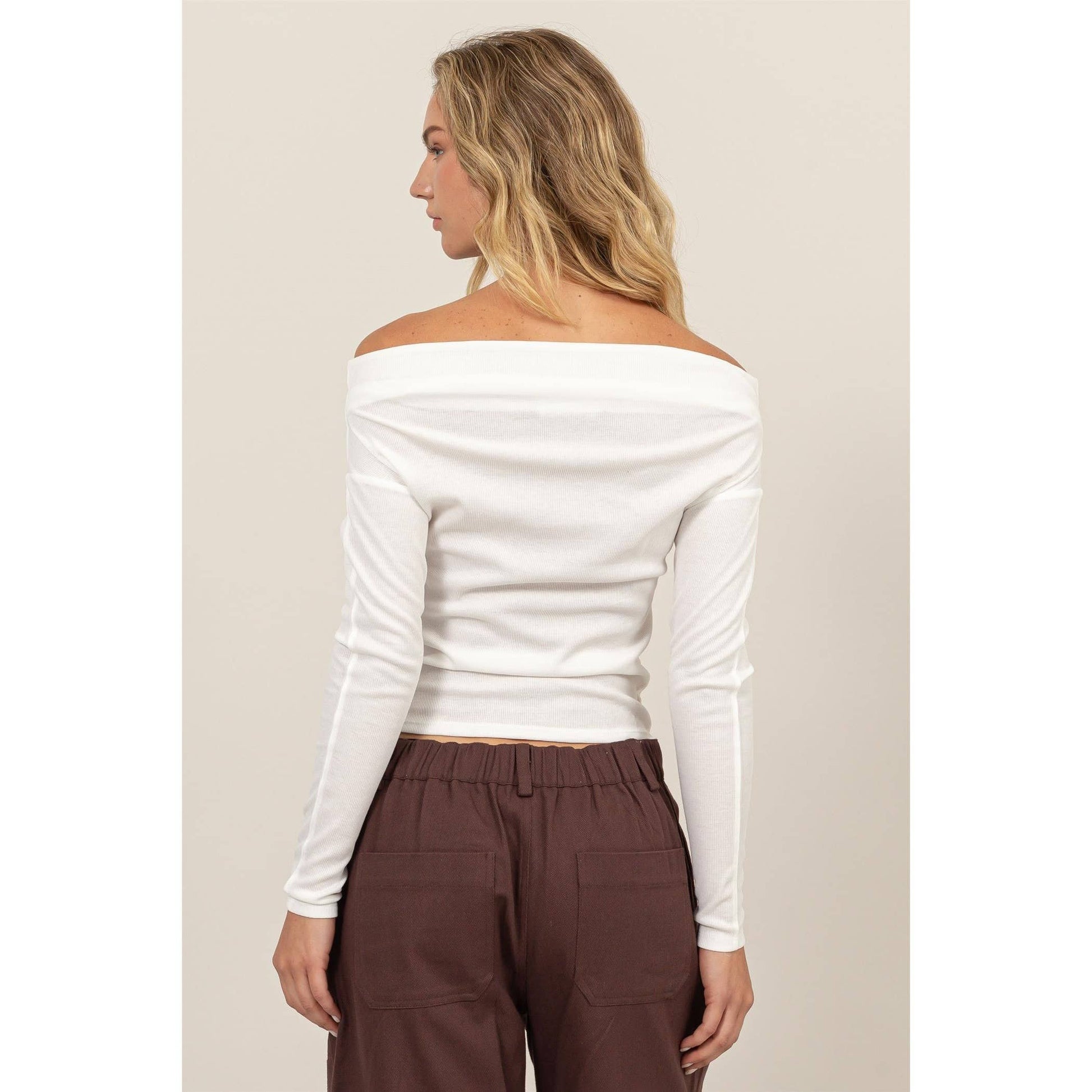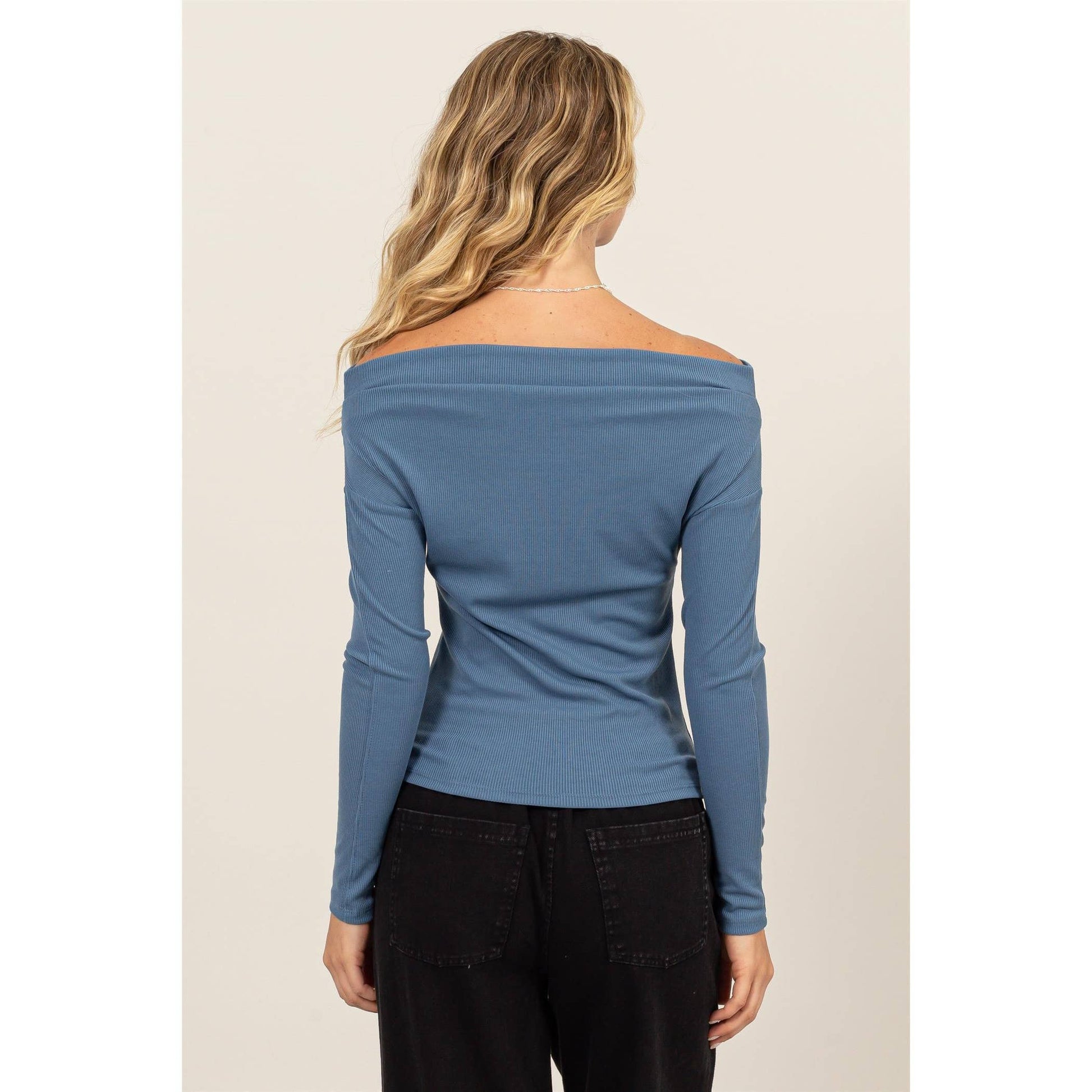 This Off-The-Shoulder Ribbed Knit Top Is A Stylish And Versatile Addition To Any Wardrobe. Crafted From A Soft, Stretchy Fabric, It Features A Flattering Off-The-Shoulder Design That Highlights The Neckline And Shoulders. The Ribbed Texture Adds A Touch Of Elegance, While The Long Sleeves Provide Warmth And Comfort. This Top Is Perfect For Both Casual And Dressier Occasions, Pairing Beautifully With Jeans, Skirts, Or Trousers. It's An Ideal Piece For Layering Or Wearing Alone, Making It A Must-Have For Your Fashion Collection.