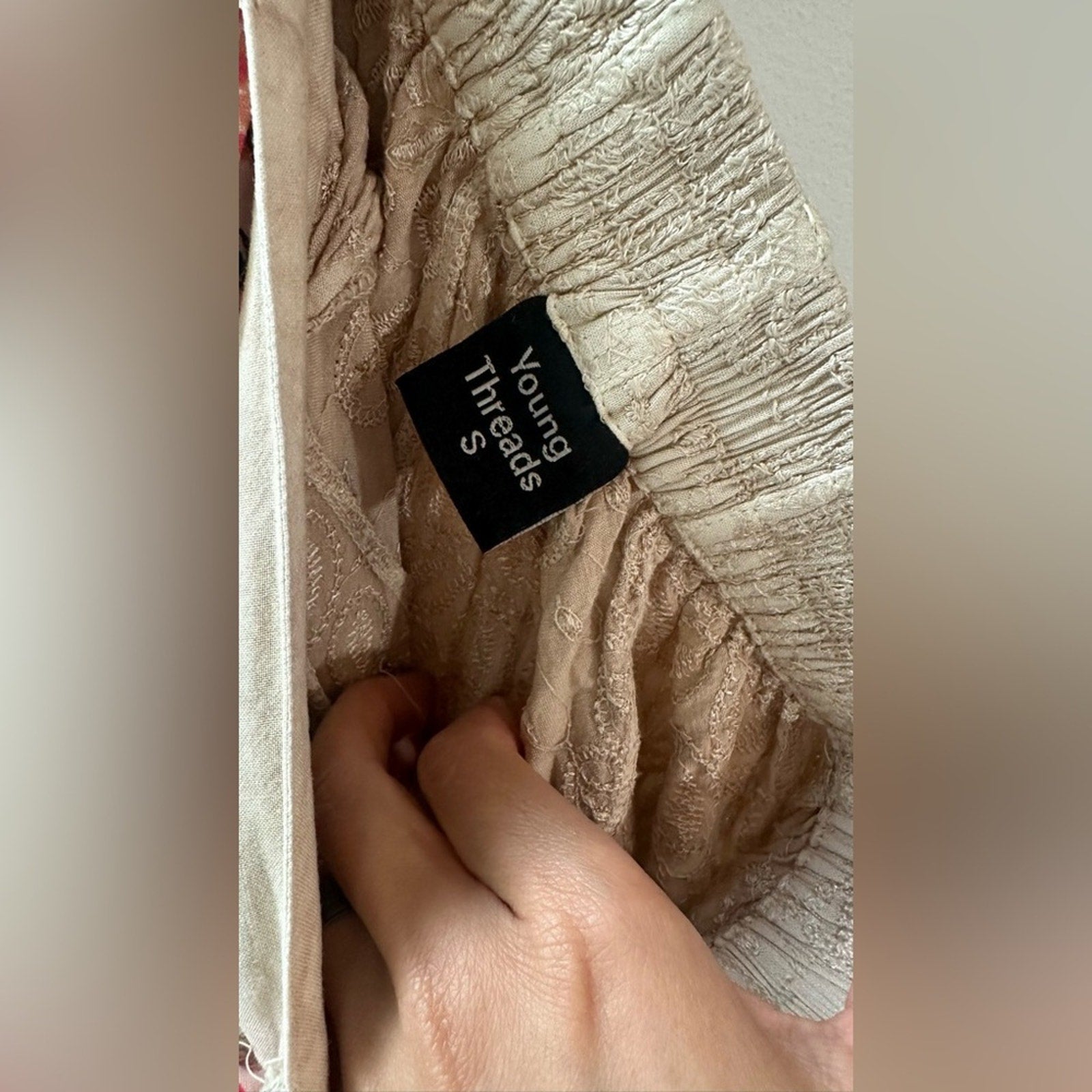 SEO Tags: young threads pants embroidered beige viscose wide leg ruffle hem boho festival size s 0838