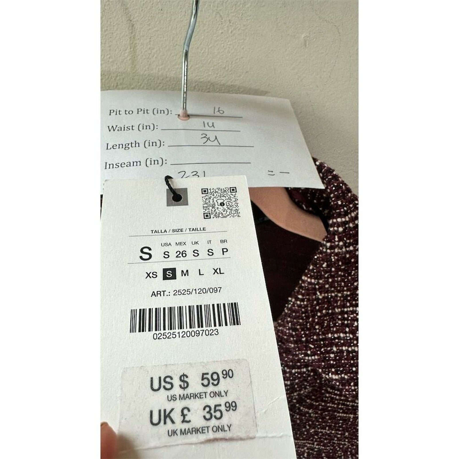 Pit to pit 16. : Zara dress, tweed dress, knee length dress, brown dress, burgundy dress, women's fashion, polyester dress, cotton blend dress, acrylic dress, Moroccan made dress, size S dress, regular size dress, new with tags dress, women's department, Zara tweed.