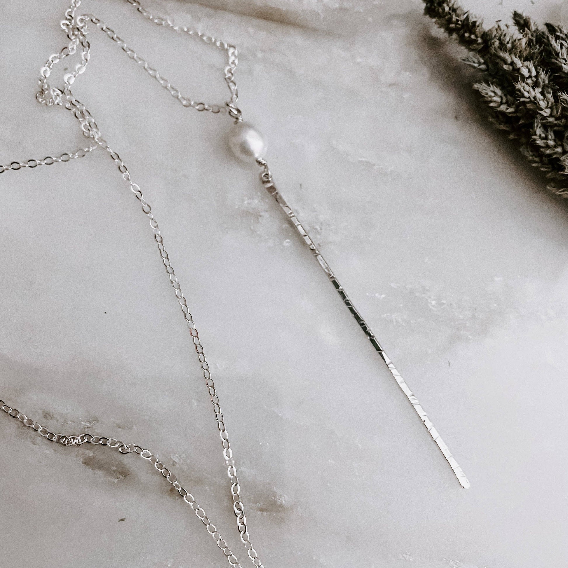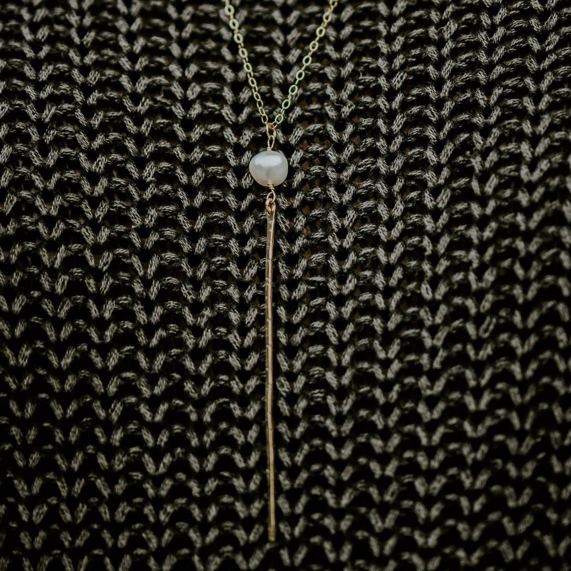 The Wanderer's Stick necklace is hand hammered and textured on both sides. A beautiful freshwater pearl finishes the look.